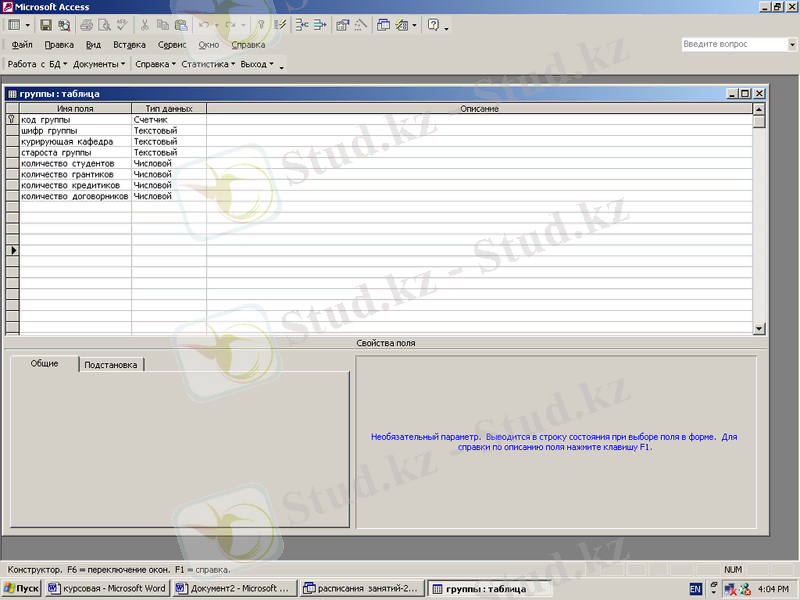 Работа с БД менюіне кіреміз(қосымша: 7 сурет) . Таблицы командасының группы кестесіне кіреміз (қосымша: 1 кесте) . Таблицы командасының предметы кестесіне кіреміз (қосымша: 2 кесте) . Таблицы командасының преподователи кестесіне кіреміз (қосымша: 3 кесте) . Енді формаларды қарастырайық. Работа с БД менюінің формы командасына кірейік (қосымша: 8 сурет) . Формы командасының группы формасына кіріп көрейік (қосымша: 9 сурет) . Формы командасының предметы формасына кіріп көрейік (қосымша: 10 сурет) . Формы командасының преподователи формасына кіріп көрейік (қосымша: 11 сурет) . Енді Работа с БД менюінің схема данных командасына кіреміз (қосымша: 12 сурет) . Енді Работа с БД менюінің окно базы данных командасына кіреміз (қосымша: 13 сурет) .
