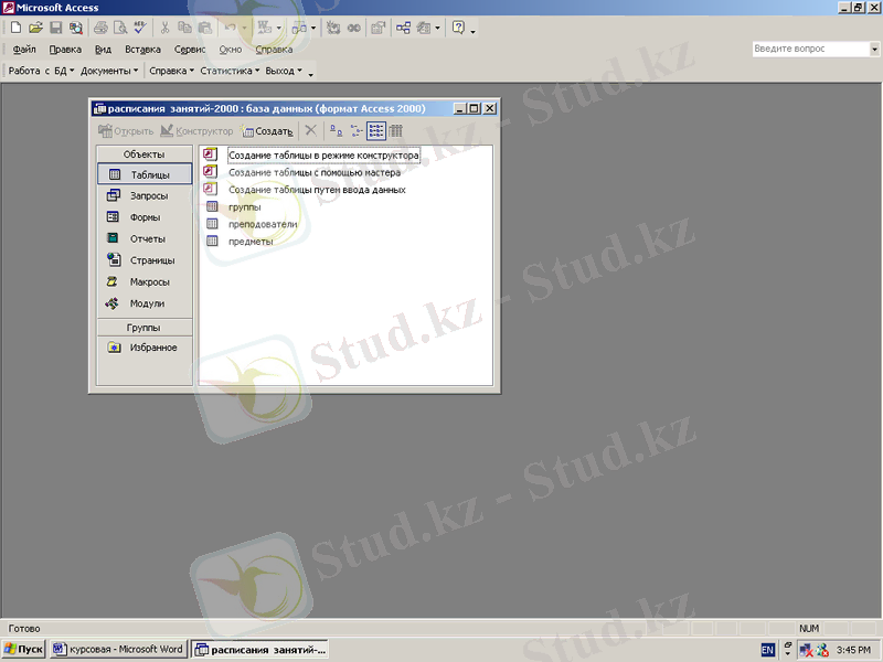 Access-ке кіргеннен кейін жаңа мәліметтер базасын ашып, расписание занятии-2000. mdb деген ат беріп сақтаймыз. Экранда мәліметтер базасының терезесі шығады. Мәліметтер базасын құрудың алгоритмін көрсетіп кетейін: