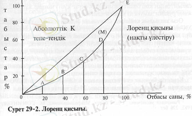 Табыстың тепе-теңсіздік денгейін Лоренц қисығынан көруге болады. Ол 29-2 суретінде көрсетілген. Горизонталь өсімі бойынша отбасы пайызы орналасқан, онда отбасының бір бөлігіне сай келетіндей табыстың белгілі денгейіне иелік керсетілген. Абсолютгік тепе-теңдіктің теориялық мүмкіндігі К түзуімен керсетіліп, ол кез келген отбасының пайызы сәйкес болатындай табыс пайызын алатындығын көрсетеді. Егер барлық отбасының 20%-ы 20%-дай (яғни 1/5 белігі) жиынтық табысты алатын болса, 40%-40%, 60%-60% және с. с; онда А, В, С, Д, Е нүктелері К сызығына орналасады. К сызығы арасындағы (М) облысы -абсолюттік тепе-тендікті көрсетеді және Лоренц қисығы (L) табысты үлестірудін тепе-теңсіздік деңгейін байқатады. «М» облысы көп болса, немесе алшақтаса, онда К сызығынан қисық алыстайды. Демек табыстың тепе-теңсіздік деңгейі жоғары. Егер табысты накты үлестіру абсолютгі тең болса, онда Лоренц қисығы мен К сызығы дөп келер еді және алшақтық жойылады.