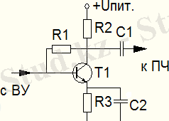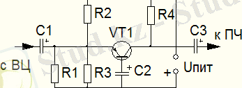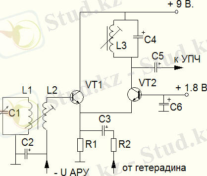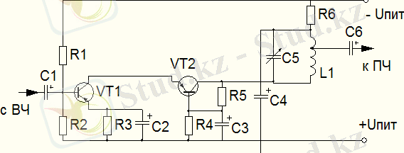 VT1-транзисторы ортақ эмиттер бойынша, ал VT2-ортақ база сұлбасы бойынша қосылған. УРЧ-ң мұндай сұлбасының артықшылығы - ол барлық диапазондарда қолданылады.
