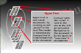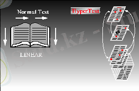 Шолуымызды мәтіндік компоненттерден бастаймыз. Негізгі талап - мультмедиа - өнімінің арлық мәтіндік фрагменттерін тұтас гипермәтіндік құрылымға біріктіру. Гипермәтін дегеніміз не? Қысқаша түрде оны қиылыспалы сілтемелермен байланыстырылған, мәтіндік ақпараттар массиві деп анықтама беруге болады. Қажетті ақпаратты іздеудің қарапайым тәсілі индекстік іздеу болып табылады. Барлық деректер белгілі бір принцип бойынша жинақталып, сұрыпталып, реттелген болуы керек. Бұған кітапханадағы алфавит бойынша немесе тақырыптың принциптері бойынша ұйымдастырылған кітаптар каталогы мысал болады. Бұл жағдайда іздеу ақпараттық бұтақ бойынша қажеттіні тапқанға дейін жүреді.