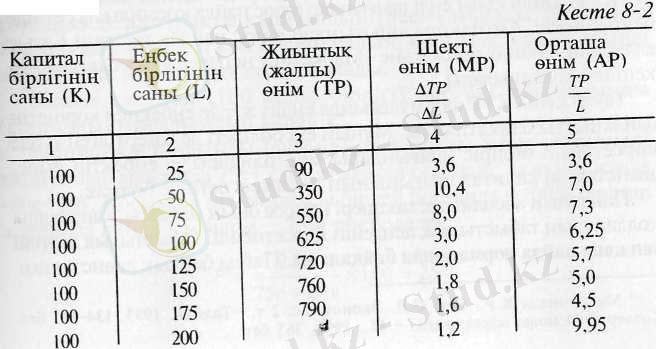 Шекті енім еңбегінің қалай өзгеретіндігін байқастық. Белгілі мәнділікке дейін ол өсе түседі; онан соң төмендей бастайды. Бұнда іиекті еңбек өнімділігі төмендеуінің іс-әрекеті байқалады. Оның чән-мағынасы мынада: егер бір фактор ұлғайса, ал баска факторлар өігеріссіз калады. онда өндіріс факторыір>ің қосымша өнімі кеми бастайды.
