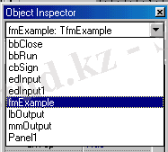 Объектiлер бақылаушысы терезесiнiң жоғарғы жағында форманың атауы және формадағы орналасқан барлық компоненттер және оларға қолданылған оқиғалар тiзiмi орналасып тұрады (7-сурет) .