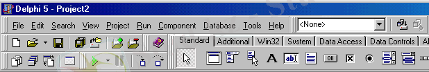 Бұл терезеде Delphi-дiң негiзгi меню жүйесi, пиктограммалық командалық батырмалары мен