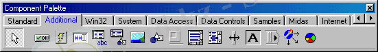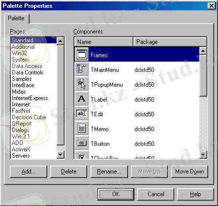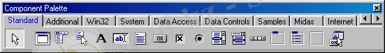 Компоненттер жинағы - Delphi-дiң негiзгi байлығы болып табылады. Ол негiзгi терeзенiң оң жағында орналасып, қажеттi компонентті тез табуға арналған белгiлерден тұрады (3-сурет) .