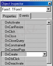 Динамикалық түрде компоненттiң атын өзгерту үшiн OnCreate (құрастыру барысындағы) оқиғаны өндейтiн программаның үзiндiсiн келтiрейiк. Объектiлер бақылаушысының терезесiндегi компоненттер тiзiмiн ашыңыз (10-сурет) . Тiзiмдегi TForm1 қатарын таңдап, Events ба ғанасындағы OnCreate қатарының оң жағын үзiлiссiз екi сырт еткiзiңiз.