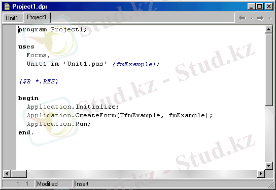 Жобаның файлы - Object Pascal тiлiнде жазылған және компилятормен өңделетiн программа. Бұл программаны Delphi автоматты түрде құрастырады (2-сурет) және ол бiрнеше жолдардан тұрады.