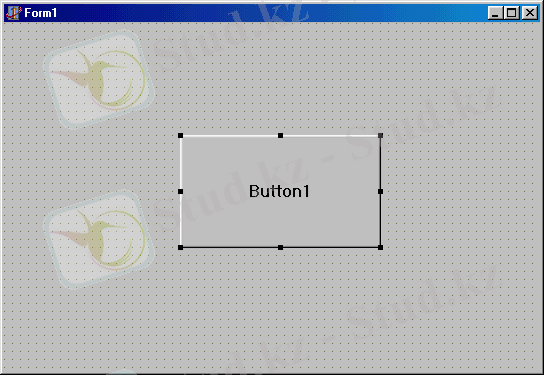 парақта орналасқан белгiлердiң үстiнен жылжытып көрген сәтте компоненттердің аты шығып тұрады. Қажеттi компонентті сырт еткiзiп белгiлеп, тышқанды форма аймағының кез-келген жерiне сырт еткiзсек, форманың бетiнде Button1 элементi пайда болады.