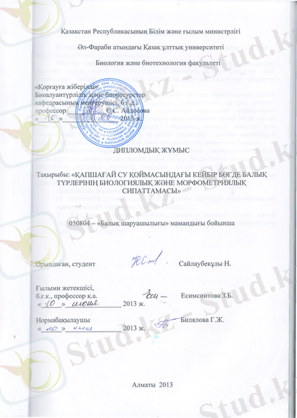 Дипломдық жұмыстың мақсаты: Қапшағай суқоймасының қазіргі ихтиофауна құрамына талдау жасау, жергілікті және жерсіндірілген балықтардың, аборигендік және интродуцияланған, кәсіптік маңызы жоқ балықтардың, бағалы және құндылығы төмен балықтардың түрлік құрамын анықтау; оның ішінде бөгде балық түрлері ретінде Persiformes және Cypriniformes отрядына жататын тыран, көксерке, қытай бұзаубасының биологиялық сипаттамаларын жасау.
