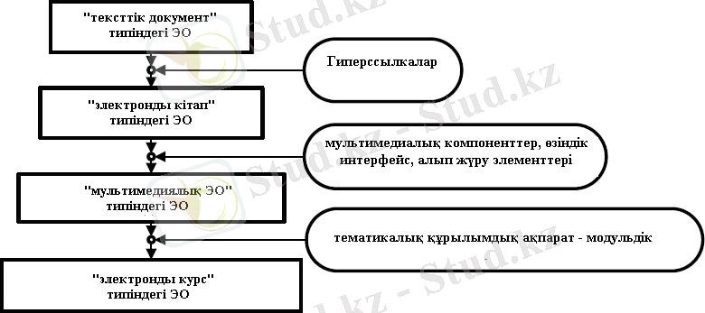 Материалды жеткізу формасына байланысты барлық ЭО-ты төрт типке бөлуге болады. Ол ЭО-тың ең қарапайым «тексттік документ» типінен қазіргі заманғы «электронды курсқа» дейінгі эволюциясының «пирамидасын» құруға мүмкіндік береді (1-сурет) .