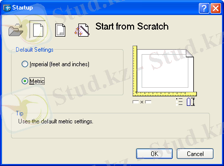 Сонан соң тышқанның сол жақ батырмасын басу керек. Ал осыдан кейін сіздің таң-дауыңызбен алынған үлкен батырма өзінің қалпын “басылғанға” өзгертеді. Ал терезенің оң жақ жоғарғы жағында орналасқан тексттік жазудың мазмұны батырманың атына моди-фикацияланады. Диалогтік тереземен жұмысты аяқтау үшін, тышқанның сол жақ батыр-масын OK батырмасы арқылы жүзеге асырылады. Егер сізге жаңа бос сурет салу керек болса, онда Startup (Жұмыстың басталуы) терезесінде Start from Scratch (Қарапайым сұл-ба) (1. 1-суретті қараңыз) батырмасын қолдану керек. Бұл тәртіп үндемеумен ұсынылады. Онда жаңа бос сызбалар тек қолданушы құрулардың минимумымен қалыптасады. Қандай өлшем бірліктерінде жұмыс істейтінін белгілеп алу керек: Imperial (feet and inches) (Ағылшынша (фут және дюйм) ) немесе Metric (Метрлік) . Екінші нұсқа бұл жағдайда біз үшін әрине қолайлы. Use a Template (Сұлба бойынша) режимін таңдауда жұмысты қандай да бір жаңа суреттің толықтырылуымен, яғни қолданушының жұмысты нөлден бастамауға мүмкіндігі болады (бұл рамка болуы мүмкін, штамптар және қандай да бір басқа сызықтар немесе құрулар) . Use a Wizard (Мастерді шақыру) режимі жаңа суретті түзету мастерінің программаларының біреуін щақыруға мүмкіндік береді. Оқырман бірінші рет Start from Scratch жасырын режимімен қолданады деп есептейміз.