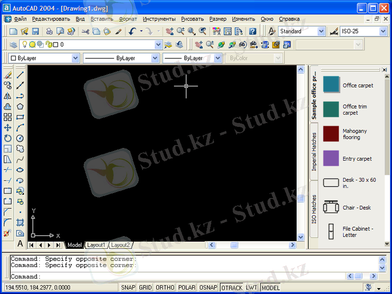 Ашылған терезеде (1. 2-суретті қараңыз) AutoCAD жұмыс терезесін, жабдықтау элементтерін бөлшектеп қарастырайық.