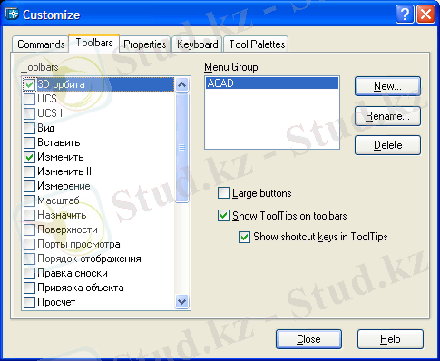 Close (Жабу) батырмасы арқылы Customize (Адаптация) диалогтік терезесін жабы-ңыз. Әрі қарай жаңа панельді бізге белгілі әдіспен экранның қолайлы жеріне апарыңыз. Осы сияқты кез келген басқа құралдар панелін қосуға болады. Егер экранға тек қана бір панельді шақыру немесе бір панельді экраннан алып тастау керек болса, онда контекстік менюді қолдануды қажет етеді. Контекстік меню тышқанның оң жақ батырмасын шерту арқылы шақырылады. Контекстік менюдің мазмұны екі шартқа тәуелді: AutoCAD жүйесі-нің қандай да бір командасы дәл осы уақытта жұмыс істей ме және осы уақытта тышқан-ның курсоры қайда болады? Тышқанның көрсеткішін қандай да бір экранда табылатын құралдар панеліне апарсаңыз, мысалы Standard (Стандарттық) панелі горизонталь орна-
