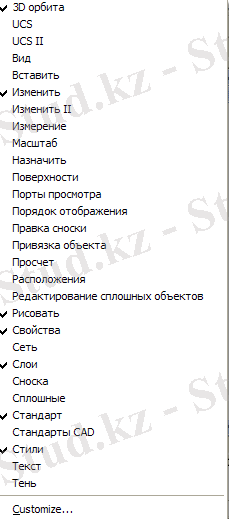 деп аталады. Панельдерді экранға шақыру және оларды экраннан алып тастау үшін ар-найы жабдықтар бар болады. Курсорды төмен түсіп тұрған менюдің View (Түр) деген аты-на апарып, тышқанның сол жақ батырмасын басыңыз. Таңдалған төмен түсіп тұрған меню графикалық экранның ішінде алынады. Сосын тышқанның көрсеткішін Toolbars (Панель-дер) төменгі жолына түсіріп, тышқанның сол жақ батырмасын басыңыз (бұдан былай эк-ранның кез келген элементін таңдауды тышқанның сол жақ батырмасын шерту арқылы таңдаймыз, ал тышқанның оң жақ батырмасы кәдімгідей қандай да бір контексттік менюді шақырады, ол туралы сөз әрі қарай жалғасады) . Toolbars (Панельдер) пунктінің аталуынан кейінгі көп нүкте менюдің бұл пункті таңдағаннан кейін ярлыктік терезені шақыруға, он-дағы қандай да бір параметрлері және ұсынылған сұрақтарға жауап беруге болатындығын білдіреді. Пайда болған Customize (Адаптация) (1. 3-суретте) диалогтік терезе қосымша Toolbars (Панельдер) таңдауда панельдердің барлық аттарын сол жақ вертикаль тізімде көрсетеді, ол AutoCAD жүйесінде берілген версияда да қолайлы. Барлық тізімді беттеп қа-рау вертикаль айналдыру сызғыштың көмегімен іске асады. Панель атының орнатылған квадраттың ішіндегі жалауша, панель экран бетінде болады, егер жалауша болмаған жағ-дайда панель экран бетінде болмайды.