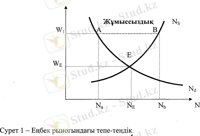 Бұл суреттен көретініміз еңбек сұранысы қисығы N d мен еңбек ұсынсы қисығы N s қиылысында Е нүктесі пайда болады, ол нүкте еңбек рыногындағы тепе-теңдікті сипаттайды. Осы тепе-теңдік нүктеге сәйкес W Е нақты жалақының және N E жұмысбастылық деңгейінің тепе-теңдігі шығады. Егер жалақының W 1 деңгейде жоғары болатын болса, онда рыноктық сәйкессіздік нәтижесінде ұсынылатын еңбек көлемі еңбекке сұраныстан В-А мөлшерде өседі, осының нәтижесінде N b - N а мөлшерде экономикада жұмыссыздық пайда болады.