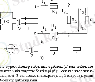 Электр тізбегіндегі әрбір қондырғы, құрылғы немесе аспап тізбектің элементі деп аталады. Тізбек элементтерін шартты графикалық белгілермен қатар, шартты әріптермен белгілеу де қабылданған. Мысалы, электр энергиясы көзін G әрпімен белгілеу қабылданған, ал графикалық белгілеудегі тiлсызық (стрелка) әрқашанда қорек көзінің потенциалы жоғары нүктесін көрсетіп тұруы керек. Тізбектің бір ток жүретін бөлігі тармақ деп аталады. Қарастырылып отырған тізбекте үш тармақ бар: cdGab, bR 3 c және bR 4 c.