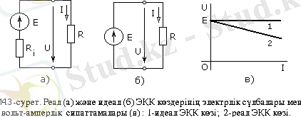 Ішкі кедергісі нольге тең деп алынған ЭҚК көзі идеал ЭҚК көзі немесе кернеу көзі деп аталады (1. 3, б-сурет) . Идеал ЭҚК көзінің кернеуі токтан, яғни жүктен тәуелсіз және тұрақты деп есептелінеді, өйткені R і І = 0 , сондықтан U = E (1. 3, в-сурет, 1- вольт-амперлік сипаттама) .