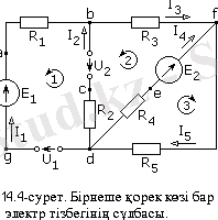Әдетте, тізбектің түйінінде бірнеше ток тоғысып жатады: бірнеше ток түйінге келіп жатса, бірнеше ток түйіннен шығып жатады. Мысалы, 14. 4-суретте в түйінінде І 1 , І 2 токтары түйінге кіріп жатыр да, ал І 3 тогы түйіннен шығып жатыр, d түйінінде І 5 тогы түйінге кіріп, І 1 , І 2 , І 4 токтары түйіннен шығып, f түйінінде І 3 , І 4 токтары түйінге кіріп, І 5 тогы түйіннен шығып жатыр.