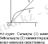 Элементтің кернеуінің тогынан тәуелділігін оның вольт-амперлік сипаттамасы деп атайды. Әдетте, элементтің тогы өскен сайын кернеуі де өсіп отырады. Бірақ осы байланысты көрсететін график - вольт-амперлік сипаттама, түзу сызық немесе қисық сызық болуы мүмкін (1. 2-сурет) . Бұл элементтің кедергісіне байланысты: егер элементтің кедергісі тұрақты болса, онда вольт-амперлік сипаттама түзу сызық та, ал элементтің кедергісі токтың әсерінен өзгеріп отырса, онда вольт-амперлік сипаттама қисық сызық болады. Вольт-амперлік сипаттамасы түзу сызық болатын элементтер сызықты, ал қисық сызық болатын элементтер бейсызықты (түзу сызықты емес) элементтер деп аталады.