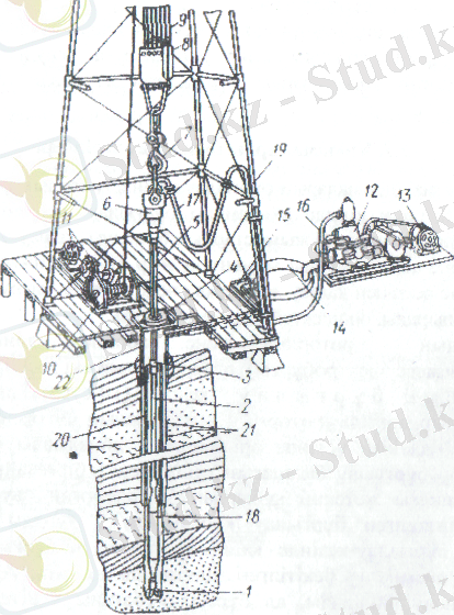1- қашау; 2 - бұрғылау құбырлары; 3 - ауыстырғыш: 4- ротор; 5 - жетекші құбыр; 6 - вертикальды люг; 7 - ілгек; 8 - белдік блок, 9 -- белдік арқан; 10 - шығыр; 11 -шығыр мен ротор даигательдері: 12 - бұрғылау сорғысы; 13 сорғы двигателі; 14 -кабылдау сыйымдылығы ; 15 - науа; 16 - андайтын кұбыр: 17 - бұрғылау күбыршегі; 18 забой двигателі ( роторлық бұрғылау кезінде Крлданылмайды) : 19 мұнара; 20 - шеген құбырлар; 21 шеген құбырлар айналасындағы цементтік қоршау: 22 --- шахталық бағыт.