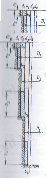 D 1 . D 2 , d 3 -- кондуктор астында, аралык және пайдалану бағаналарын бұрғылау кезінде пайдаланатын сәйкес қашаулар диаметрлері; d 1 , . D 2 ,, d 3 . d 4 - аралық және пайдалану бағаналарын, кондуктор бағытының диаметрі; һ 1, һ 2, һ 3 һ 4 - бағыт, кондуктор. аралык және пайдалану бағаналарының сыртында кұбырдан тыс кеңістіктегі цементтеу аралыктары; L 1, L 2, L 3, L 4 - бағытты кондукторды, аралық және пайдалану бағаналарын түсіру тереңдіктері