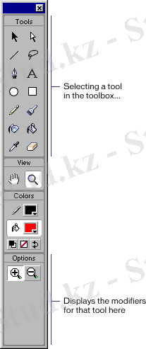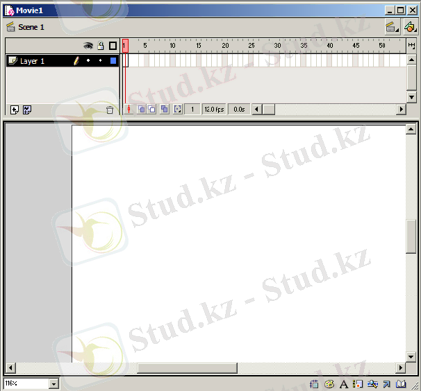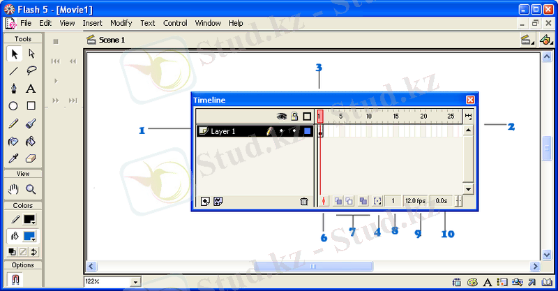 Flash 5 программасын іске қосқанда аталған құралдары бар терезе ашылады. 1-суреттің төменгі бөлігінде төрт негізгі компоненттері көрсетілген.
