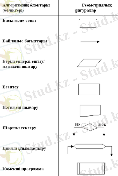 Блок-схема пайдаланылатын геометриялық фигуралар блогтық-таңбалар, ал байланыс-нұсқамлара ағын сызығы деп аталады. Ағын сызығы фигурадан фигураға өту жолын көрсету, яғни ақпараттарды және мәліметтерді өңдеудің ретін көрсету үшін пайдаланылады.