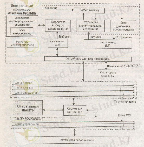 2 суретте Intel Р6 негізіндегі микропроцессорлар базасында компюетерлер сұлбасы көрсетілген, оған Pentiun Pro/II/III жатады. Сұлбада орталық процессор, оперативті жады, сыртқы құрылғылар көрсетілген. Жүйелік құрсым қосымша кеңею құрсымына ие. i486 және Pentium базасындағы компьютерлерде бұл құрсым негізінде PCI (Peripheral Component Interface) қолданылады, бұған сыртқы құрылғылар қосылады, әрі ертеректе қолданылған құсымдар қосылады (ISA - Industry Standard Architecture) .