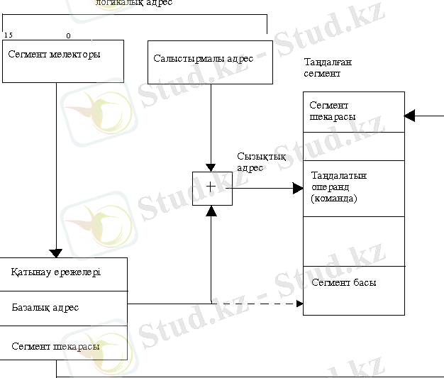 - Стек сегменті. Бұл сегмент стеку деп аталатын жады аймағы болып табылады. Шағынпроцессор стекпен жұмысты келесі принцип бойынша ұйымдастырады: осы аймаққа жазылған соңғы элемент бірінші болып таңдалады. Бұл сегментке қатынау үшін, стек сегментінің адресін қамтитын ss (stack segment register) регистрі қызмет атқарады.