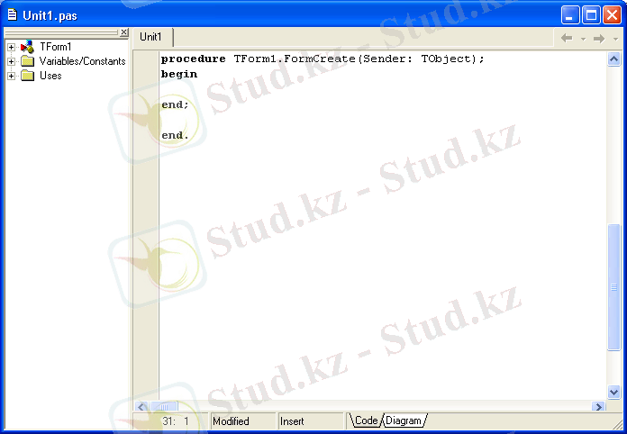 TForm1. FormCreate - форманы екі рет шерту оқиғысына жауап ретінде құрылатын процедураның құрама атауы. Ол нүкте арқылы ажыратылған екі бөлімнен құралған: біріншісі - класс атауы (Tform1) Delphi-де әр қайсысы ұқсас толық бір іс-әрекетті орындай алатын бағдарламалау тобы класс деп, олардың біреуі класс данасы делінеді, екіншісі - процедура өз аты. Ол объект және окиға атауларының қосындысынан тұрады (оқиға атауының алдында On қосымшасы жазылмайды) [9, 57−69 бет] .