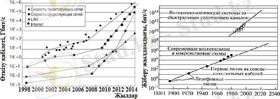 Сурет 1. Желілерде жіберу жылдамдығының соңғы он жылдықта өсуі және байланыс жүйелерінің салыстырмалы ақпараттық сыйымдылығының соңғы 100 жыл ішінде өзгеруі