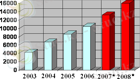 Алматы қаласы бойынша компьютерлік техника сатылымға келетін болсақ, 5. 1-кестеден 2003 - 2008 дейінгі аралықтағы компьютерлік техниканы сатып алу статистикасы келтірілген. 5. 1-суретте компьютерлік және оргтехника сатылым көлемінің өсуі көрнекті түрде көрсетілген. (Деректер Алматы қаласының кейбір компьютерлік фирмаларының деректері бойынша алынған) . Сатылым көлемін болжамалау уақыттық тізімдерді талдау және экстрополяция әдістері көмегімен жүзеге асырылды. Есептеу нәтижесінде келесі түрдегі теңдеу алынды: