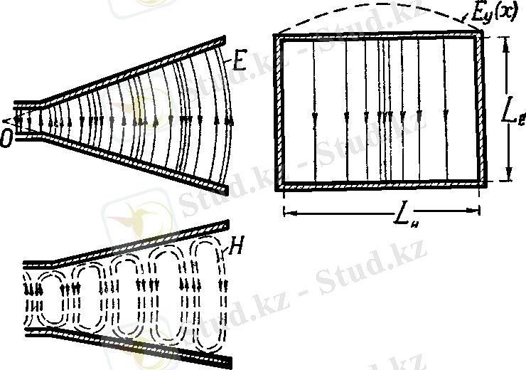 1. 2-сурет. Пирамида тәрізді рупордың және оның толқын өткізгішінде қуаттанатын электромагниттік өрісін үлестіру.
