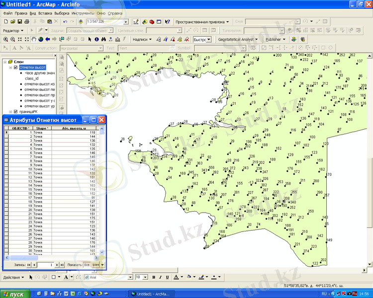 - Spatial Analyst қосымшасы арқылы осы территорияның 1:5 масштабтағы топографиялық қартасынан биіктік белгілерін нүктелік қабатқа түсіреміз, барлық биіктік өлшемдері мәліметтер базасында тіркеледі.
