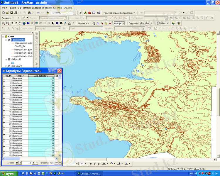 2-сурет. Горизонталь сызықтары бейнеленген сызықтық қабат және мәліметтер базасы (атрибуттар кестесі)