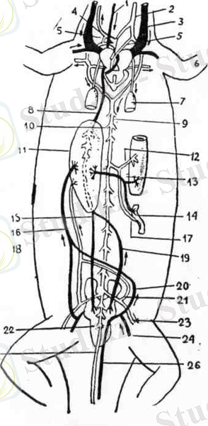 1 - бас венасы; 2 - ұйқы артериясы; 3 - шық-шыт венасы; 4 - ұйқы безі құйылысы; 5 - қолқаның сол доғасы; 5 - қолқаның оң доғасы; 6 - өкпе артериясы; 7 - өкпе; - төменгі қуыс вена; 9 - арқа қолқасы; 10 - омыртқа аралық артерия; 11 - бауыр; 12 - ішек артериясы; 13 - бауырдың қақпа венасы; 14 - тоқ ішек; 15 - төменгі қуыс вена; 16 - құрсақ венасы; 17 -шажырқай артериясы; 18 - сыртқы шажырқай артериясы; 19 - алып кеткіш бүйрек венасы; 20 - сол жамбас венасы; 21 - сол жамбас артериясы; 22 - бүйрек; 23 -артқы аяқ артериясы; 24 - артқы аяқ венасы; 25 - құйрық артериясы; 26 - құйрық венасы.
