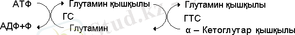 Бұл реакцияның жүруіне АТФ қажет. Глютаматсинтетаза болса глютаминнің амид тобын а-кетоглутар қышқылына ауыстырып, ферредоксиннің қатысуымен, глутамин қышқылының екі молекуласы пайда болатын реакцияны катализдейді. Өсімдікке енген аммиак а-кетоглутар қышқылынан басқа да органикалық қышқылдарға байланысып, тиісті ферменттердің қатысуымен алғашқы амин қышқылдардан түзіледі. Олардың қатарына қымыздық, сірке, пирожүзім, глиоксил және т. б. қышқылдар жатады. Олардың тотықсызданып аминдену (трансаминдену) нәтижесінде, тиісінше аспарагин, серин, глицин амин қышқылдары синтезделінеді.