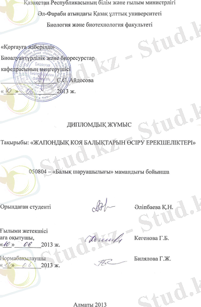 Дипломдық жұмыстың мақсаты : Алматы хайуанаттар бағындағы жапониялық коя балығын аквариумдық жағдайда өсу ерекшеліктерін зерттеу және коя балығының өсу ерекшеліктеріне сипаттама беру, алынған мәліметтерді әдебиет көздерімен салыстыру. Алматы хайуанаттар бағындағы жапониялық коя балығының өсу жағдайын бақылау.