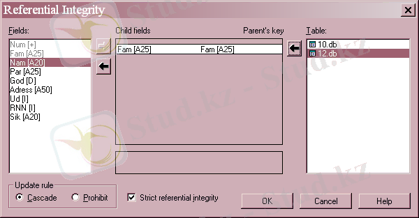 Update rule - радиобатырмалар тобы егер бас кестеде кілттік өрісті өшіргенде қосымша кестеде болатын өзгерістерді анықтайды. Егер Prohibit - ті таңдасақ, онда Database Desktop бұндай операцияны болдыртпайды. Егер де Cascade опциясы тұрса, онда кілттік өрісі бар бас кестеде өзгеріс болса, онда қосымша кестеде де өзгеріс болады. Ал егер сіз бас кестеден кілт өрісі бар жазбаны өшірсеңіз, онда қосымша кестеде сол кілттік өрісі бар жазба автоматты түрде өшеді.