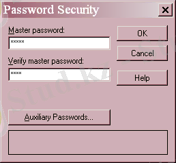 Password Security бөлімі Paradox - та құрылған кестелерге және оның әр өріс жазбасына пароль қоюға мүмкіндік береді. Бұл үшін Define батырмасын басу керек, сонда диалогтық терезе шығады. Диалогтық терезеде басты парольді (Master password терезесі) қоюға және сол парольді мақұлдауға (Verify master password) мүмкіндік аламыз. Егер Auxiliary Password (қосымша парольдар) батырмасын бассақ қосымша парольдарды тағайындауға және өрістерге қатынаудың ережесін көрсетуге болады.