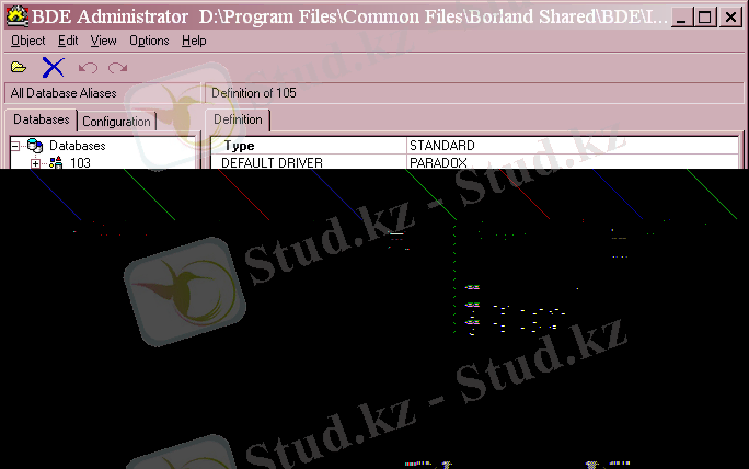 Деректер базасымен жұмыс, ережеге сай, бірқолданушылық режимде жұмыс істейді. STANDART драйверлер үшін әдетте Paradox деректер базасы, мінездемелер псевдонимі жиынтығы минималды болады: Type - драйвер аты және PATH - деректер базасына жол. PATH параметрін басқанда, сіз көп нүктелі батырманы көресіз. Оны басқанда Windows - тің жаңа каталогты таңдау стандартты диалогы ашылады, ол арқылы біз керекті каталогты таңдап аламыз.