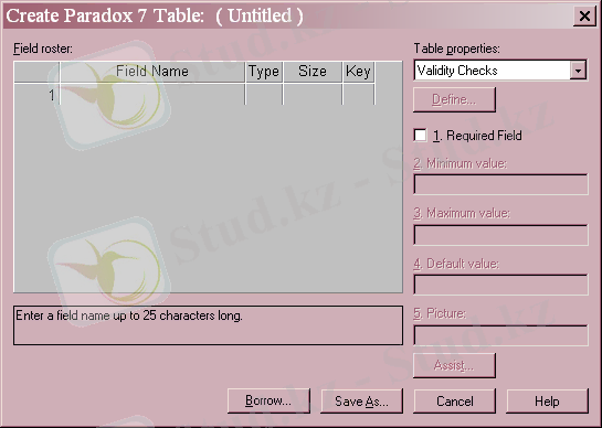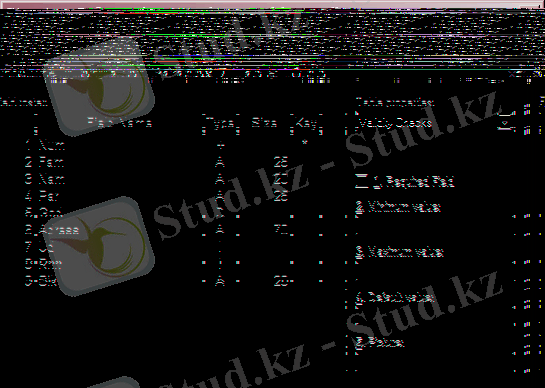 Құрылып жатқан кестенің әрбір өрісіне бір жазба сәйкес келеді. Field Name бағанына өріс атын, Type - символ, өрісте сақталынатын мәліметтердің типін анықтайды. Size бағанына - сан қойылады, өрістің ұзындығын анықтайды, Key -«*» символы, егер бұл өріс бойынша біріншілік кілт қою керек болса қойылады.