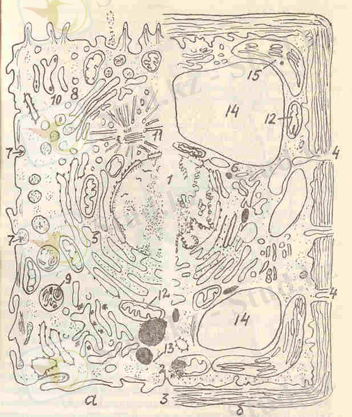 а - жануар клеткасы, б- өсімдік клеткасы; 1- хроматыны және ядрошығы бар ядро, 2 - плазматика мембранасы, 3 - клетка қабығы, 4 - ІІлазмодеома, 5 - кедір-бұдырлы эндоплазмалық тор, 6 - тегіс эндоплазмалық тор, 7 - пиноцитоз вакуолі, 8 - Гольджи аппараты, 9 - лизосом, 10 - тегіс эндоплазмалық тордағы май тамшылары, 11- центрольдер, микротүтікшелер жоие центросфералар, 12 - митохондрия, 13 - гиалоплазманың полирибосомдары, 14 -- орталық вакуоль, 15 - хлоропласт.