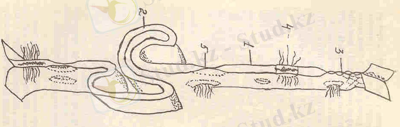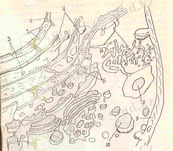 1 - ядро қабықшасы, 2 - ядро қабықшасындағы торлар, 3 - полисомалар, 4 - кедір-бұдырлы эндоплазмалық тор, 5 - жазық эндоплазмалық тор, 6- ауыспалы көпіршіктер, 7 - вакуоль, 8 - диктиосома, 9 -плазматикалық мембрана, 10- цитоплазмалық көпіршік.