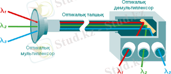 Яғни бір талшық арқылы арқылы мыңнан аса стандарттық каналдар құруға болады. Себебі DWDM мультиплексоры ұзындығы әр түрлі максималды 160 толқын жасай алады. DWDM-нің приципиалды схемасы қарапайым. Бір талшық ішінде біренеше оптикалық каналадар жасау үшін SDH сигналдарын әр түрлі “түске бояйды”, бұл процесс 1. 1-ші суретте көрсетілген. “Боялған түстер” мультиплексор арқылы араласып оптикалық желі арқылы жіберіледі. Соңғы пункте кері процесс жүргізіледі, яғни “боялған түстердің” SDH сигналдары топтық сигналдардан ажыратылып, тұтынушыларға жіберіледі. Демультиплексор жұмысы 1. 2-ші суретте айқындалады.