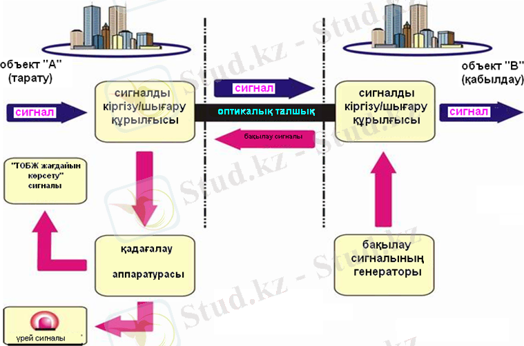 д) Ақпаратпен заңсыз иемденуден мықты қорғанысы. Опто-талшықты ка-бельде радиодиапазондағы сәулелер қолданылмағандықтан жүйені бұзбайынша тасымалданушы ақпаратты тыңдау өте қиын. Оптикалық желі байланысының үздіксіз жұмыс істеуін қадағалау жүйесі талшықтың жоғарғы сезімталдық қасиетінің арқасында бұзылған байланыс каналын сол мезетте өшіріп, үрейлі сигналды қосады (1. 4-ші суретті қара) [4] .