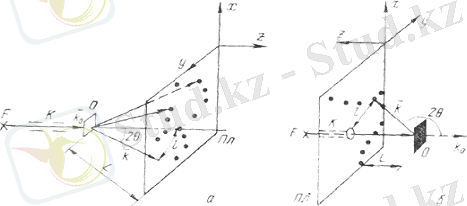 Рис. 3 Схема съемки рентгенограмм по методу Лауэ (а - на просвет, б - на отражение, F - фокус рентгеновской трубки, К - диафрагмы, O - образец, Пл - пленка)