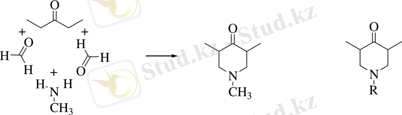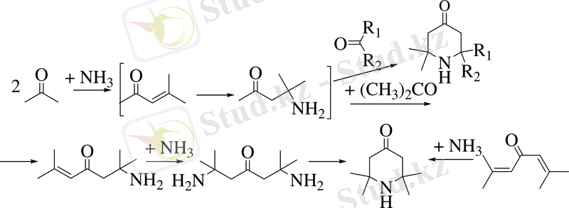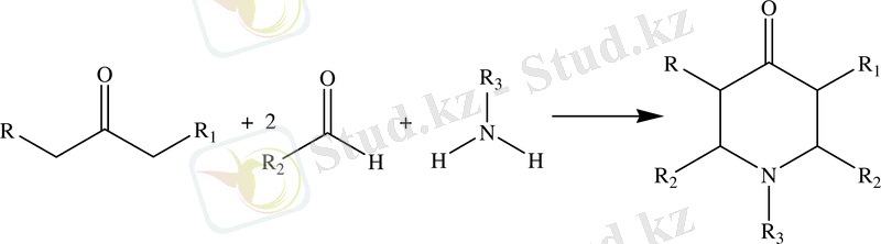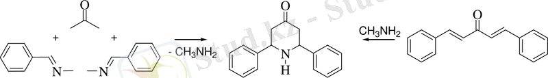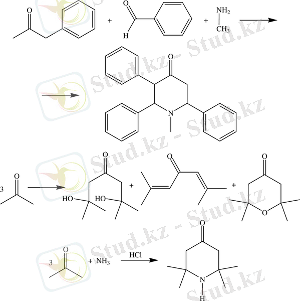 Метилбензилкетонның бензальдегидпен және метиламинмен сірке-спирт ортасындағы конденсациясының нәтижесінде 34 % шығыммен 1-метил-2, 3, 6-трифенилпиперидин-4-он алынды /43/. Ал ацетонның аммиакпен конденсациясында (хлорлы кальций, катионалмастырғыш шайырлар, Льюис қышқылы) катализатор қатысуындағы сияқты, олардың қатысуынсыз да 2, 2, 6, 6-тетраметилпиперидин-4-он түзілген /44/.