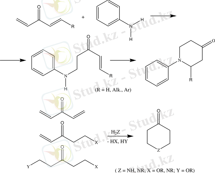 Қазіргі таңда пиперидин-4-ондарды синтездеу жөнінде тәжірибелік материалдардың жиналғаны соншалық, тіпті оларды реакцияның жүру бағытына байланысты екі түрге бөлуге болады /1, 2/: