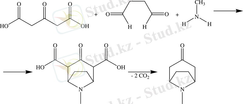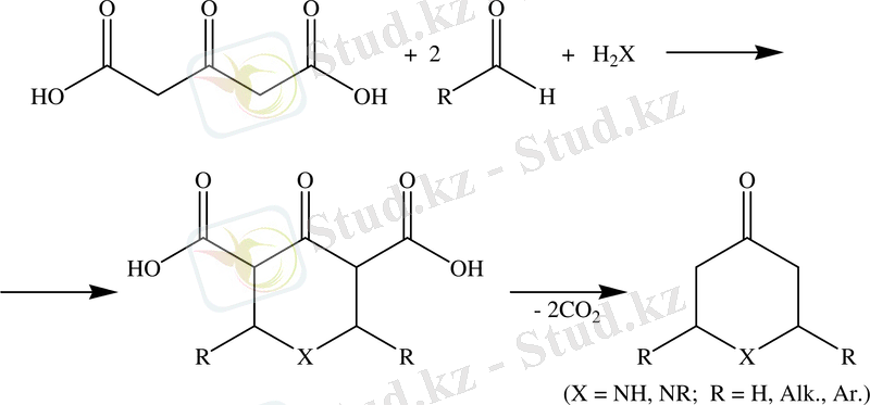 Осы кетонмен Петренко-Криченко реакциясы - амин қатысында ацетондикарбон қышқылы эфирінің альдегидпен конденсациясын көруге болады /45-49/. 2, 6-Дифенилпиперидон-4 шығымы 50-70 % құрайды. Бұл реакция Робинсон бойынша тропанон синтезі негізіне тиісті болып келеді.